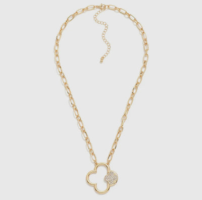 Metal Tone Chain Link Necklace Featuring Hollow Metal Clover Pendant With Pave Rhinestone Clover Accent - Approximately 14" L - Extender 3" L
