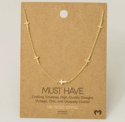 This gold dipped dainty cross station necklace style. Immerse yourself in fashion finesse with this statement trending necklace. This trending necklace approximately measures (Inches): L: 16 in and is 100% BRASS