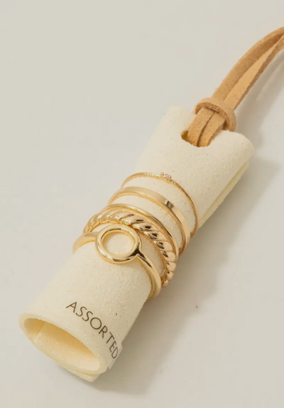 This ring set features a fashionable mixed styled 5pc band rings set style. Indulge in the artistry of accessorizing with this unique piece. ASSORTED SIZES 90% BRASS 10% CZ